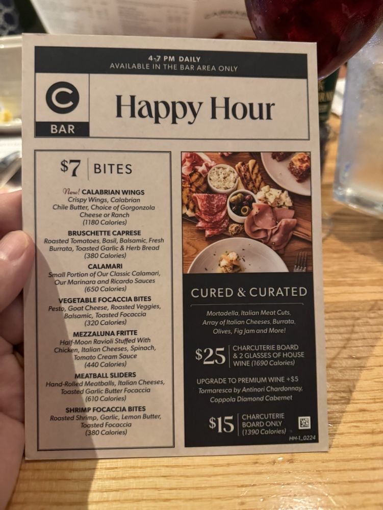 “ More of a 3.5 than a full 4- Went here for happy hour with some gal pals! Bar was full and there was a bit of confusion at the hostess stand but they still got us seated in a booth by the bar and we were able to get the happy hour menu! I got a pomegranate martini which I liked, but my friend did not. The other girls got sangrias and liked both the flavors. We also got some happy hour apps - mozzarella sticks which were seasoned! Calamari, tasty but came out very cold. And meatball sliders. The meatball was just ok but the focaccia was good! Our server was very sweet and got everything out in a timely manner; she was also super patient. ”